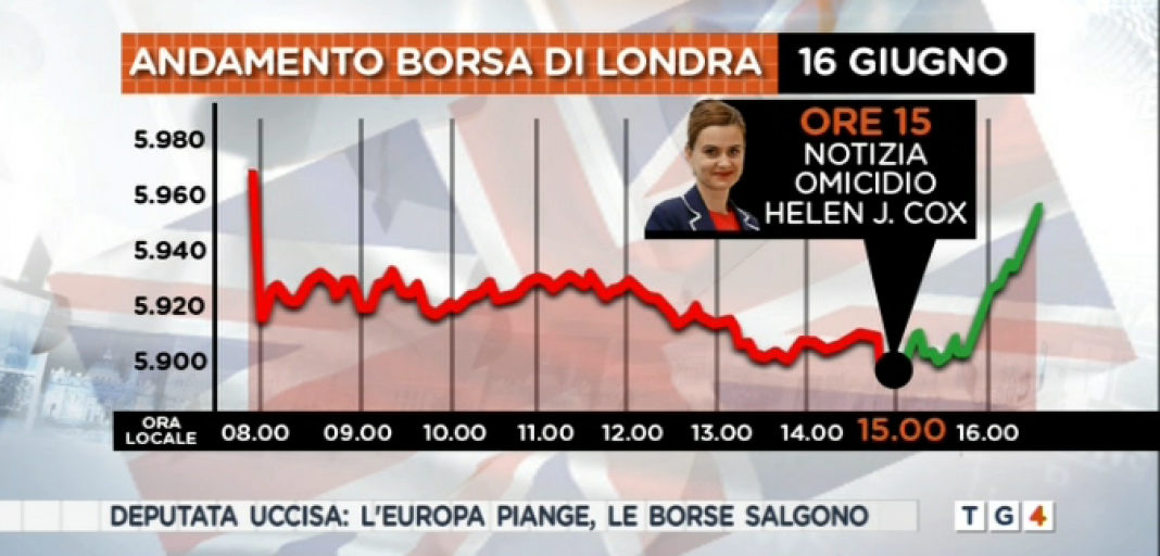 Tg3 è quello che riporta a galla i numerosi casi in cui il neonazismo negli ultimi anni ha fatto vittime in America come in Europa: Atlanta negli Stati Uniti, Breivik in Norvegia ed oggi in Gran Bretagna. La riflessione che almeno per noi si impone, è che i punti di contatto dei vari estremismi che attaccano la pacifica convivenza, dall’integralismo islamista all’esplosione del razzismo omicida, all’ideologia individualistica che considera “uomo” solo chi è corredato da una colt o da un mitragliatore, hanno molti elementi in comune, anche se si incanalano in solchi apparentemente diversi, se non opposti. Spostando lo sguardo sulle reazioni nel sistema finanziario del Vecchio Continente, l’intuizione se vogliamo “scontata” di Tg La7 di ieri sera torna “in chiaro” su molte testate, dopo aver fatto mostra di sé su tutti i siti di informazione: le borse hanno letto l’omicidio di Helen Cox come un aiuto ai fautori della permanenza della Gran Bretagna nella UE. “Lacrime e cinismo, le borse fanno boom”: questo è il commento nel titolo di Tg4.