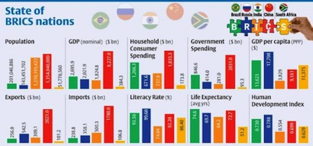 I BRICS sono nati in un contesto storico-economico caratterizzato dalle insufficienze del sistema di Bretton Woods, evidenti dagli anni ’70 del secolo scorso, allo scopo di affermare una diversa governance dell’economia mondiale. Dal punto di vista storico-politico, è stato ipotizzato che l’interesse strategico comune delle attuali leadership dei BRICS potrebbe essere la difesa del modello di identità collettiva statale-nazionale (scaturito dalla Pace di Westfalia del 1648) e contrapposto al modello glocalista rappresentato simbolicamente dal sistema finanziario globale sviluppato intorno al dollaro. L’economia e la politica sono fattori integrati, e quale dei due determini l’altro è un punto di discussione aperto tra gli studiosi.