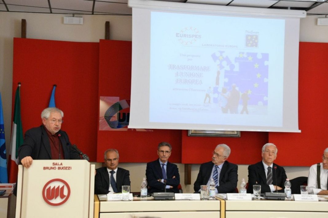 A incanalare i lavori, lanciando la proposta di trasformare l’Unione europea attraverso l’Eurozona, ovvero a partire dai Paesi che hanno la moneta unica, è stato Carmelo Cedrone, coordinatore del Laboratorio Europa dell’Eurispes: «Siamo un gruppo di persone libere – ha affermato – che vogliono ragionare e presentare delle proposte sull’Unione europea, con la sua debolezza istituzionale, i limiti del processo decisionale, i guasti creati dalla crisi economica e il cambiamento di percezione dei cittadini, che ancora una dozzina d’anni fa credevano nell’Europa nata nel 1957 con il Trattato di Roma e ridefinita nel 1992 dal Trattato di Maastricht, ma adesso non più».
