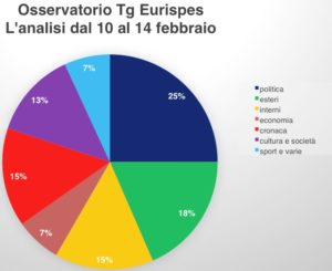 Dopo settimane incentrate sull’emergenza coronavirus, la politica riguadagna le prime pagine del prime time, ottenendo 23 aperture. A reclamare l’attenzione sono gli scontri interni alla maggioranza e il voto sul caso Gregoretti. L’analisi dell’Osservatorio Tg Eurispes e Coris Sapienza dal 10 al 14 febbraio.