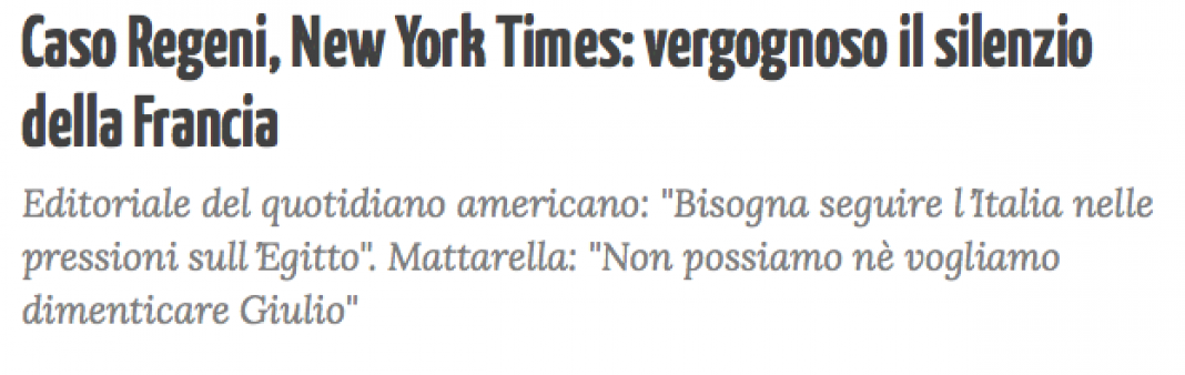I Tg di venerdì 15 aprile – Nell’ultimo giorno della campagna sul cosiddetto “referendum anti-trivelle” (apertura solo per il Tg1) ad avere il sopravvento nelle scalette dei Tg sono i dati sugli oltre 6.000 profughi sbarcati in Italia negli ultimi 5 giorni e il caso Regeni che conquista un palcoscenico internazionale con l’odierno articolo del New York Times. Su questo caso, i Tg registrano (apertura per Tg5, titoli per tutti) l’ulteriore intervento del Presidente Mattarella che dichiara “non possiamo né vogliamo dimenticare” la fine di questo giovane. La solidarietà del New York Times al governo italiano, il suo invito ad una mobilitazione coesa delle democrazie occidentali e la critica durissima alla Francia per il suo “totale disimpegno”, sono ripresi abbondantemente da tutte le testate (copertina per Tg5). L’accusa esplicita a Hollande è di privilegiare i contratti miliardari tra Parigi ed Il Cairo (vendita di armamenti) rispetto alla solidarietà con l’Italia. Sempre in tema di “relazioni pericolose”, il cedimento di frau Merkel ad Erdogan con l’autorizzazione a processare in terra tedesca il comico “responsabile” di offese nei confronti del leader turco, è ampiamente presente sui Tg4 (Tg4) e nei servizi di Tg3 e dei Tg delle 20.