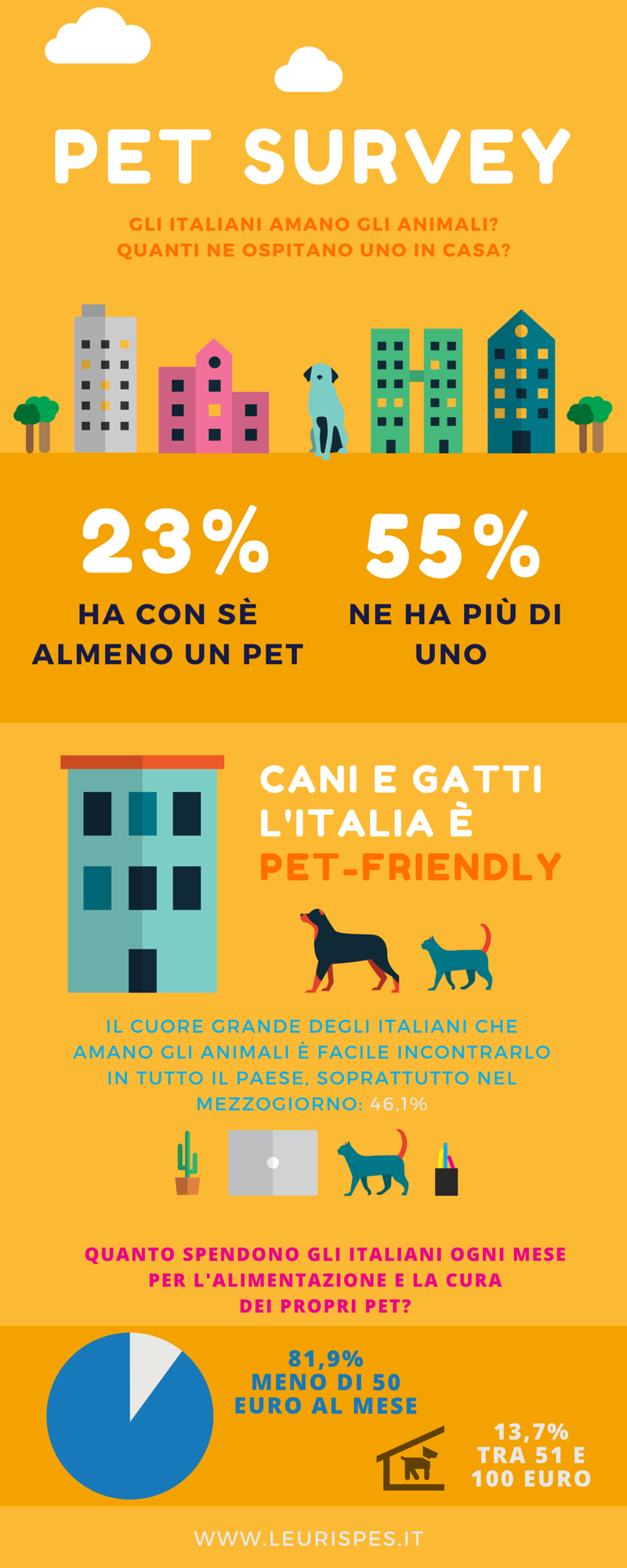 Prendersi cura di un animale, si sa, comporta diverse spese inerenti l’alimentazione, l’igiene, le cure veterinarie… Quanto spendono gli italiani ogni mese per non far mancare nulla al proprio pet? La stragrande maggioranza, l’81,9%, non oltrepassa la soglia dei 50 euro mensili.