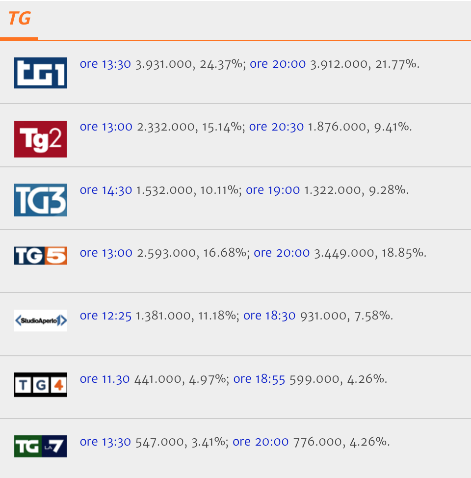 Dati auditel dei Tg di domenica 21 giugno 2015
