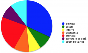 Tabella dei titoli in percentuale. Totale titoli: 212. Argomenti presenti nelle titolazioni: 294; politica 32% (94 presenze, per il 44% dei titoli), cronaca 22% (66 presenze, per il 31% dei titoli), sport e varie 11% (31 presenze, per il 14% dei titoli), economia 10% (29), esteri 9% (26), cultura e società 9% (26) e interni 7% (22).