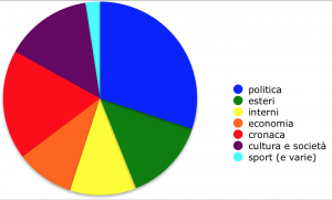 Tabella dei titoli in percentuale. Totale titoli: 206. Argomenti presenti nelle titolazioni: 289; politica 30% (87 presenze, per il 42% dei titoli), cronaca 18% (53 presenze, per il 26% dei titoli), cultura e società 15% (42 presenze, per il 20% dei titoli), esteri 14% (40), interni 11% (32), economia 10% (28) e sport e varie 2% (7).