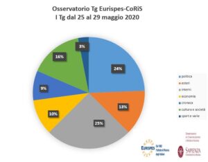 Quanto agli esteri, gli Stati Uniti dominano per tutta la settimana; le immagini della morte di un afro-americano, soffocato da un poliziotto durante un arresto, e le violente proteste che ne sono seguite, scalano ben 7 titoli tra giovedì e venerdì. Sempre sugli States, martedì sia Tg1 che Tg5 avevano titolano sulle difficoltà di Trump, ma anche di alcuni altri leader conservatori, «con il vento in poppa prima del virus, ora in difficoltà per la gestione della pandemia» (Tg1). Preoccupazione soprattutto per i contagi nel Brasile di Bolsonaro. Tg2 ancora una volta dimostra la sua predilezione per il Presidente Usa, e sorvola sullo scontro fra Trump e la piattaforma social Twitter, molto ripreso, invece, da Tg3 e Tg5. Grande attenzione sia per Tg2 che Tg La7 alla repressione delle proteste ad Hong Kong, con Mentana che critica la mancata presa di posizione dell’Italia. Mercoledì, il Tg di Sangiuliano fa di più, dedicando apertura e primo servizio ad una intervista al Cardinale Emerito di Hong Kong, che denuncia come la Cina vuole «schiacciare la sua città con violenta brutalità», mentre dovrebbe «offrire maggiori risposte sulla pandemia».